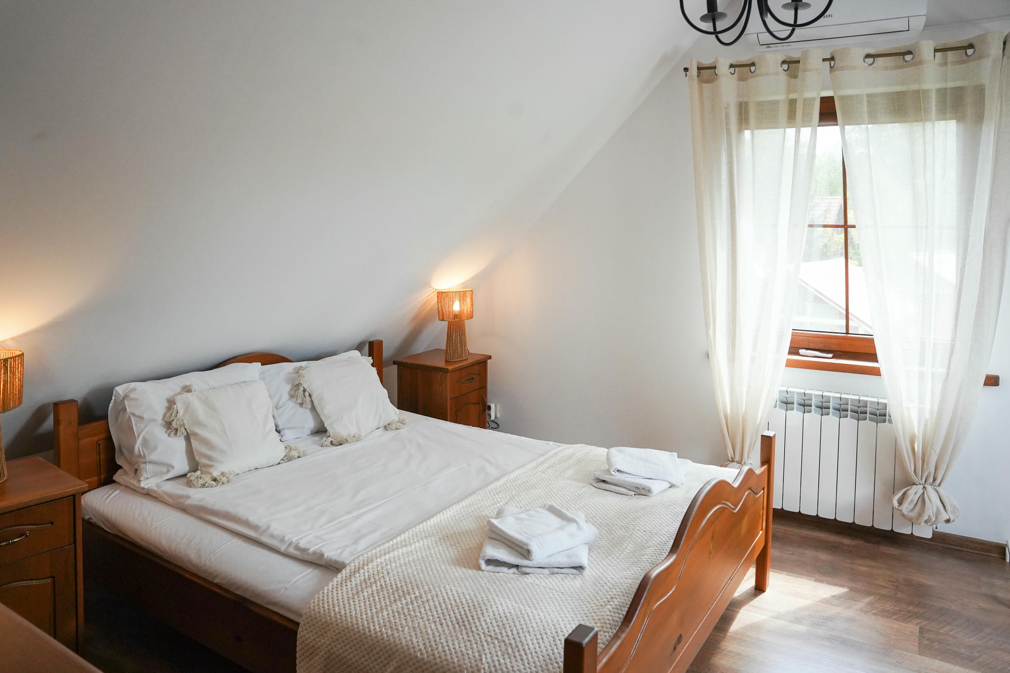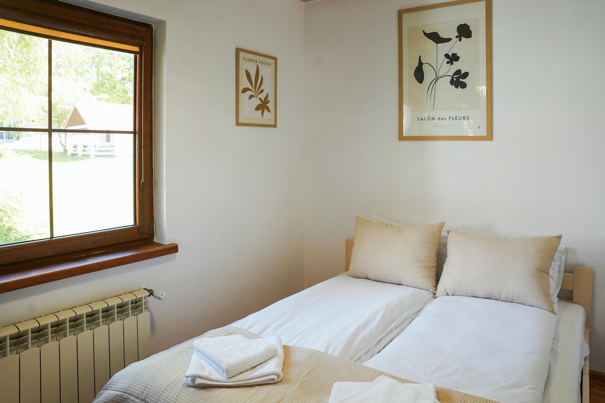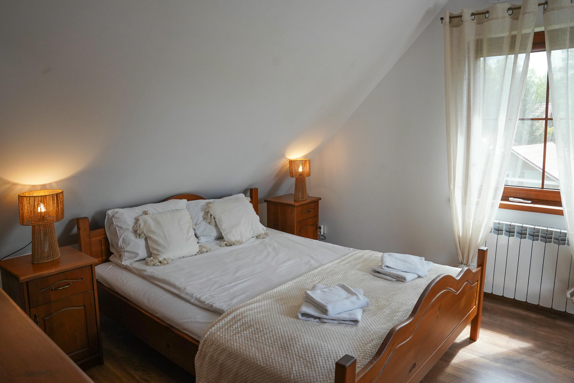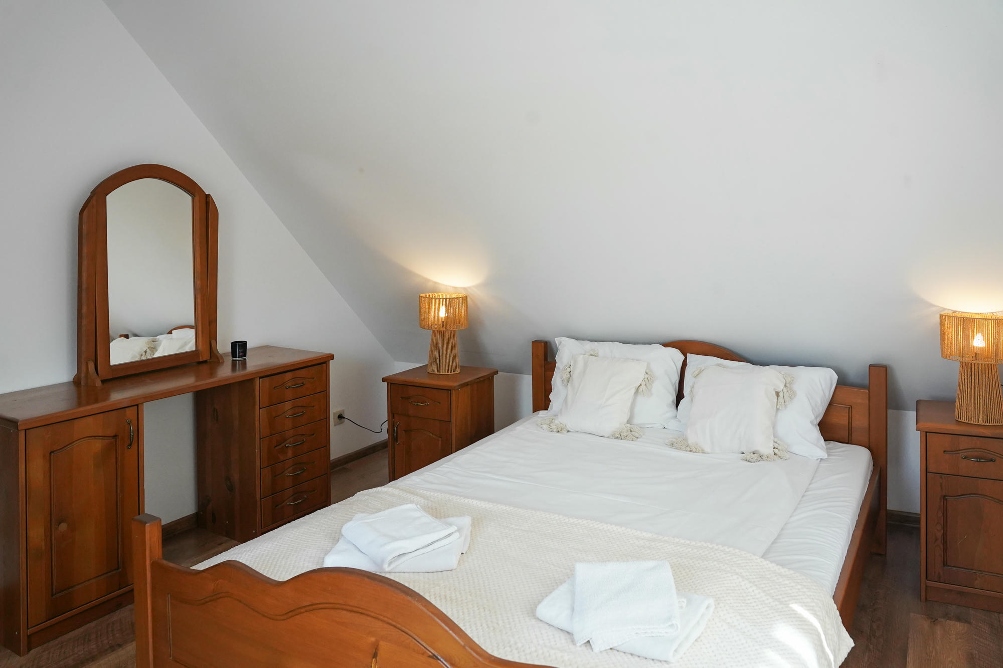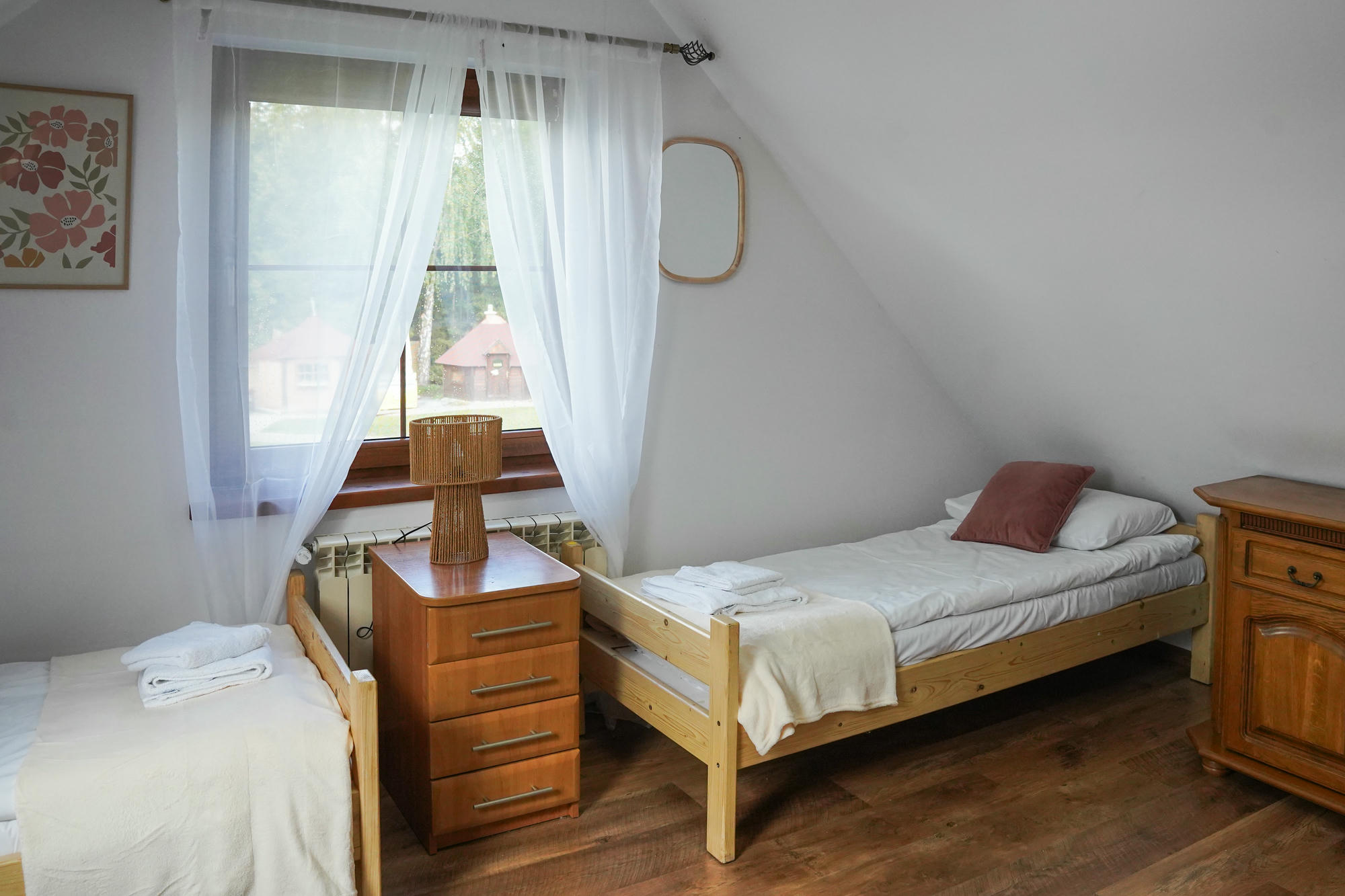 Lubimy zaskakiwać – i trzeba przyznać, że ostatnio wychodzi nam to całkiem nieźle! Oddajemy do Waszej dyspozycji nasz duży dom, idealny nawet dla 10 osób. Do dyspozycji gości są dwie sypialnie z podwójnymi łóżkami oraz jedna z pięcioma łóżkami pojedynczymi, toaleta na piętrze i przestronna łazienka z prysznicem oraz pralką na parterze. Wspólne chwile umili przestronny salon z wygodną kanapą i aneksem kuchennym, a prawdziwą perełką jest prywatny ogród z meblami ogrodowymi i bezpośrednim dostępem do jeziora. Brzmi dobrze? No ba! Teraz wystarczy tylko zarezerwować i cieszyć się mazurskim klimatem nad wodą.