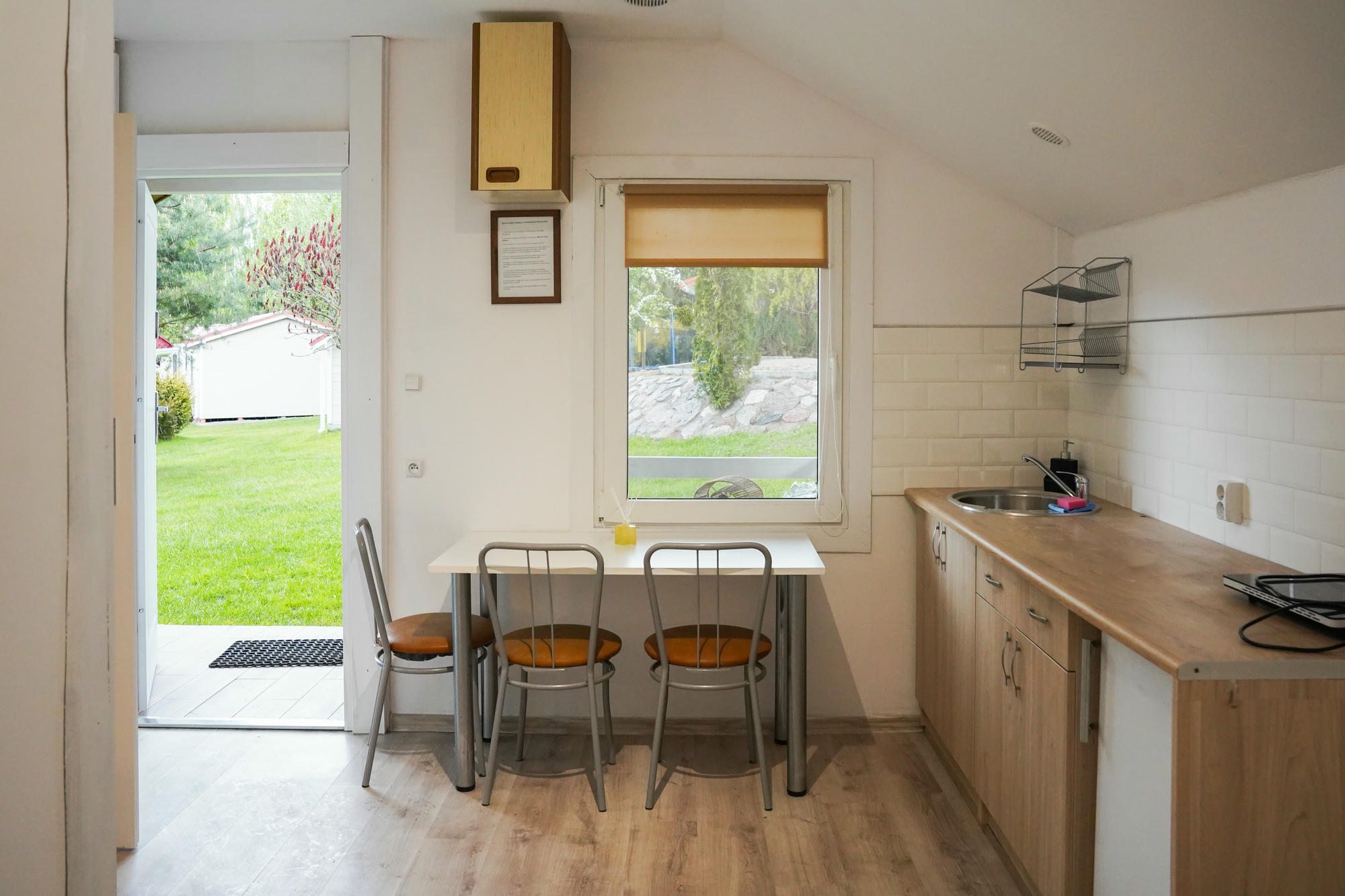 Domek 4-osobowy oferuje przestronne wnętrze, w którym każdy członek rodziny lub grupy znajomych znajdzie dla siebie wygodne miejsce. W domku znajduje się telewizor z płaskim ekranem, dostęp do internetu WiFi, szafa oraz aneks kuchenny wyposażony w lodówkę, płytę kuchenną, czajnik elektryczny i przybory kuchenne. Komfort zapewnia również prywatna łazienka z prysznicem, ręczniki, pościel i całoroczne ogrzewanie. Do dyspozycji gości jest również taras z meblami ogrodowymi – doskonały do odpoczynku na świeżym powietrzu.